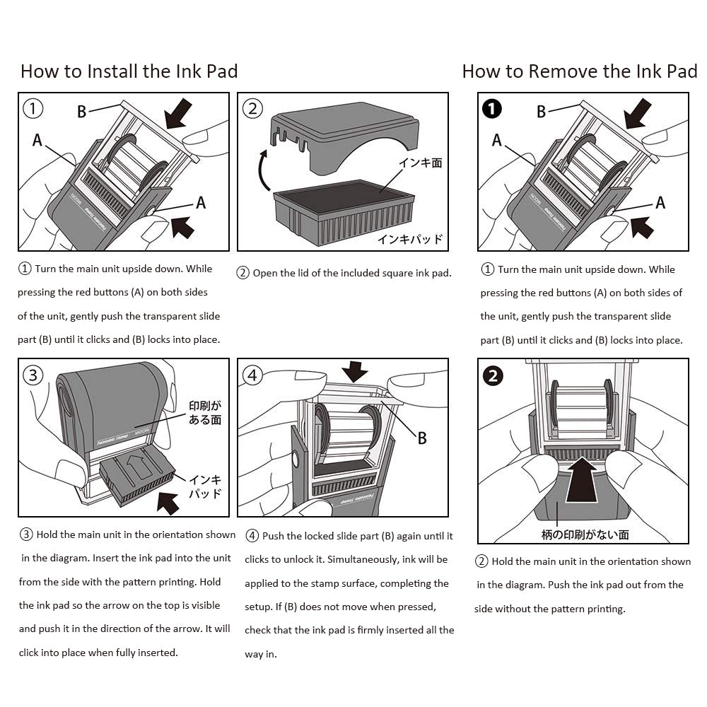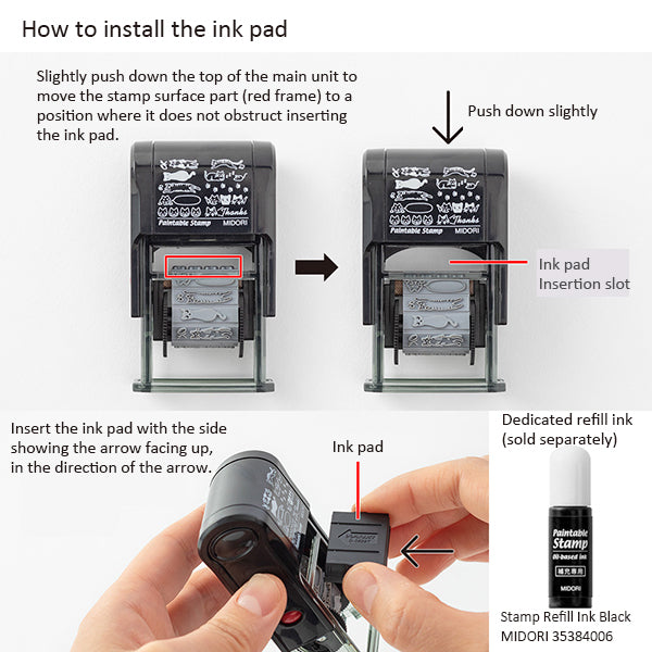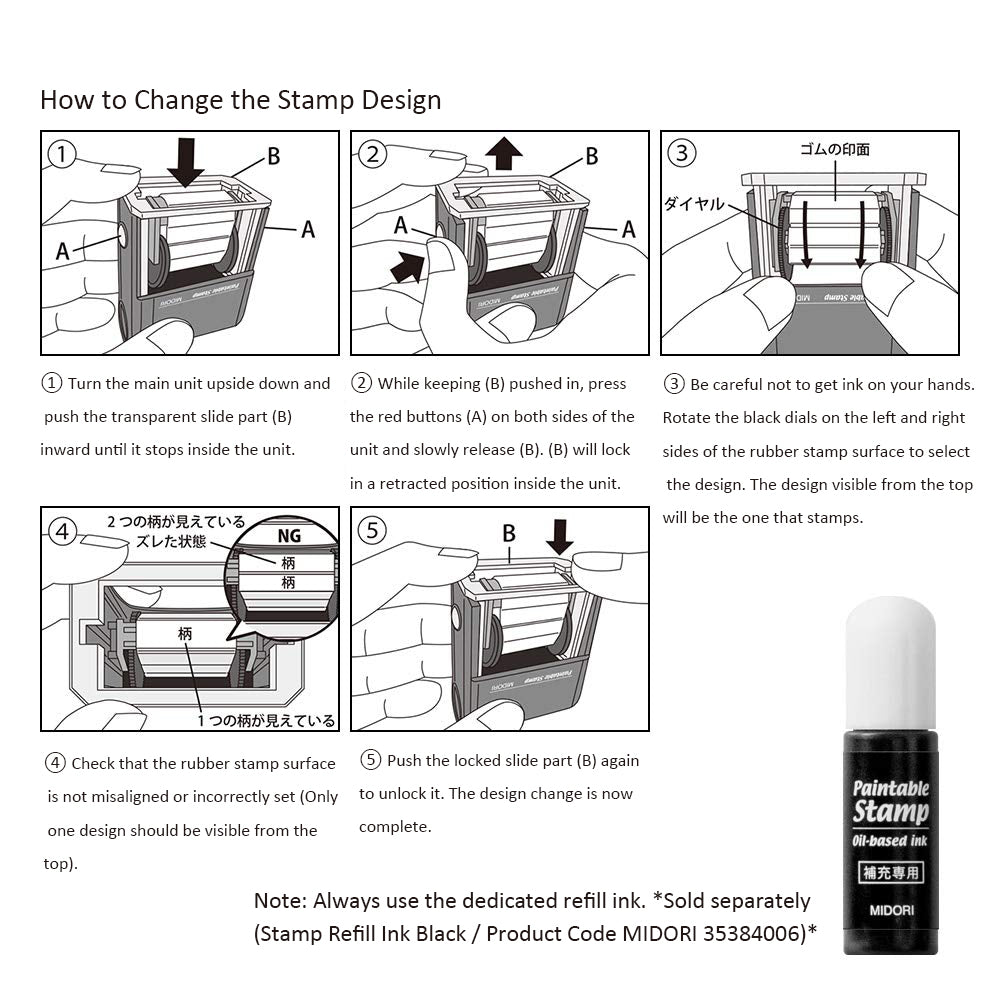 Read the instructions and load the included ink into the stamp. Test the stamp several times before use. Press on a flat surface. Pressing too hard will result in too much ink coming out and thick lines. Press the printed side of the stamp against you to prevent the design from being upside down. If you will not be using the stamp for an extended period of time, remove the ink pad from the stamp and store it with the lid on. Since this stamp uses oil-based ink, be careful not to get it on clothing, etc. Depending on the paper material you are using, the ink may take longer to dry or may bleed. Do not rub the rubber part of the stamp with your fingers or sharp objects, as this may cause damage. Do not store near open flames or in high-temperature locations (such as inside a car in the summer or in direct sunlight). If the ink becomes thin, use the separately sold special black ink refill. |